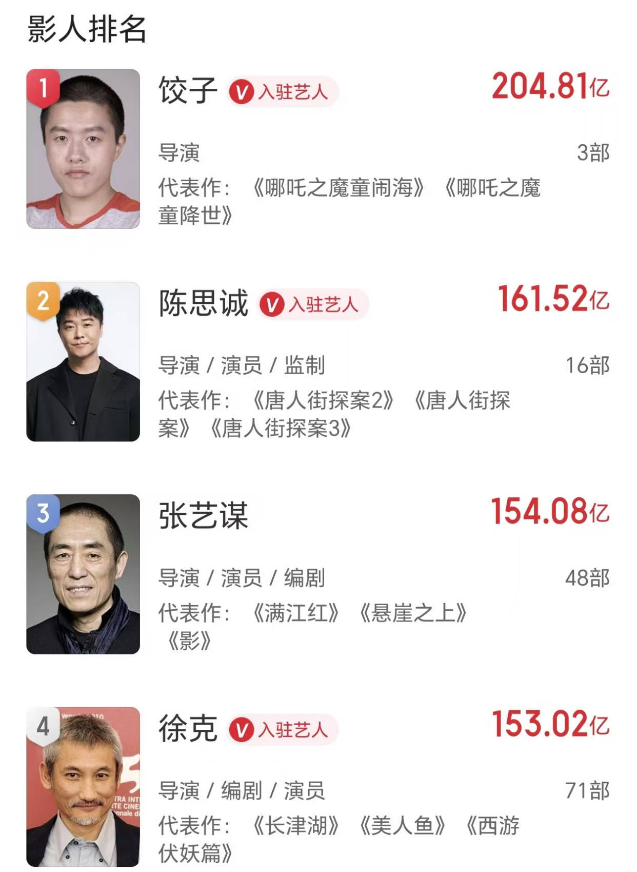 饺子导演执导的《哪吒》系列两部影片,总票房就栽植了200亿东谈主民币,以庞大的上风位列第别称。陈想诚的主要作品则是《唐探》系列,共四部电影票房加起来打破了百亿东谈主民币,再算上其它作品,共有161亿东谈主民币。