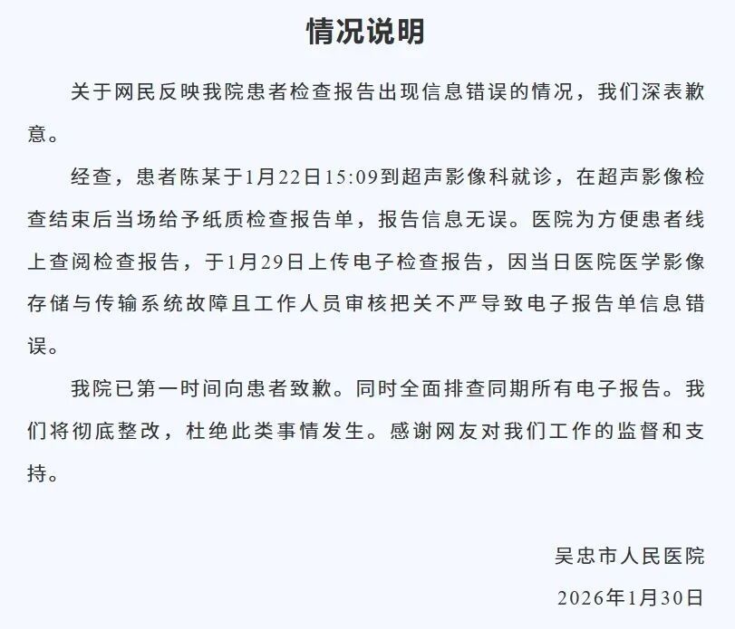 1月30日开云体育(中国)官方网站,吴忠市东说念主民病院发布情况讲明: 对于网民反馈我院患者查验论述出现信息不实的情况,咱们深表歉意。 经查,患者陈某于1月22日15:09到超声影像科就诊,在超声影像查验贬抑后就地赐与纸质查验论述单,论述信息无误。病院为便捷患者线上查阅查验论述,于1月29日上传电子查验论述,因当日病院医学影像存储与传输系统故障且职责主说念主员审核把关不严导致电子论述单信息不实。 我院已第一时分向患者致歉。同期全面排查同期所有电子论述。咱们将透澈整改,根绝此类事情发生。感谢网友对咱们职责的监督和支援。 据倾盆新闻此前报说念,有网友发文称,73岁老爷子腹黑不适到宁夏吴忠市东说念主民病院查验,超声查验效果透露:宫内早孕,不排斥胚胎停育可能。院方回答:严肃照管,核实走漏后落实到位。