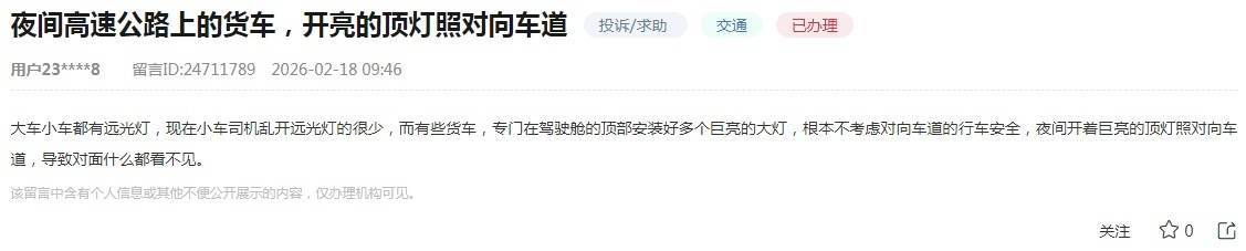 东谈主民网成皆3月22日电 (章华维)日前,有网友在东谈主民网“勾通留言板”投诉,称夜间高速公路上有货车开巨亮的顶灯照对向车谈。对此,四川省公安厅看护信访总队暗示,对“货车涉嫌罪犯加装顶灯的一律严查严办”。