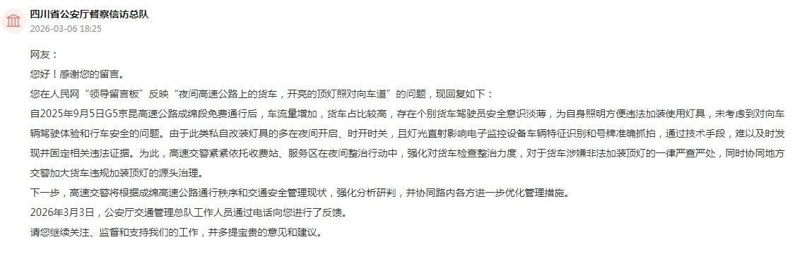 针对留言,四川省公安厅看护信访总队复兴暗示,自2025年9月5日G5京昆高速公路成绵段免费通行后,车流量增多,货车占相比高,存在个别货车驾驶员安全意志澹泊,为本人照明便捷犯科加装使用灯具,未琢磨到对向车辆驾驶体验和行车安全的问题。由于此类暗里改装灯具的多在夜间开启、时开时关,且灯光直射影响电子监控竖立车辆特征识别和号牌准确持拍,通落后刻技巧,难以实时发现并固定关联犯科凭证。